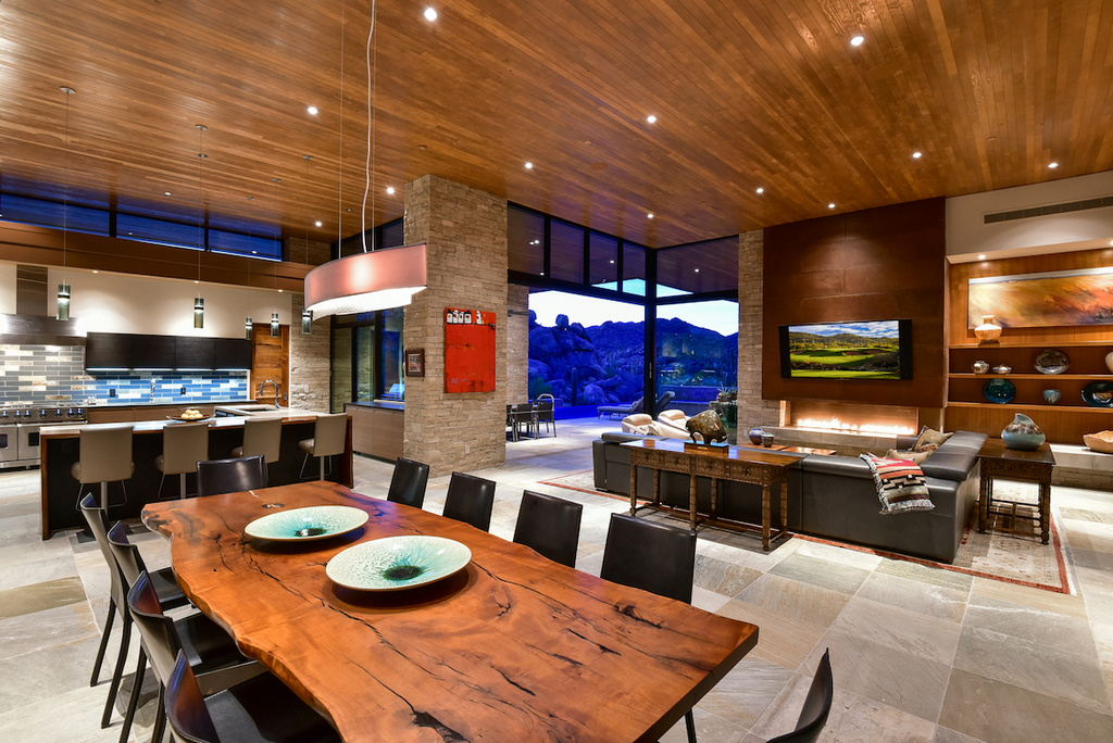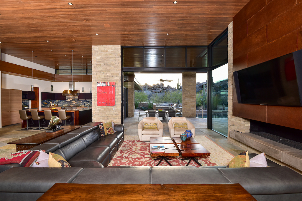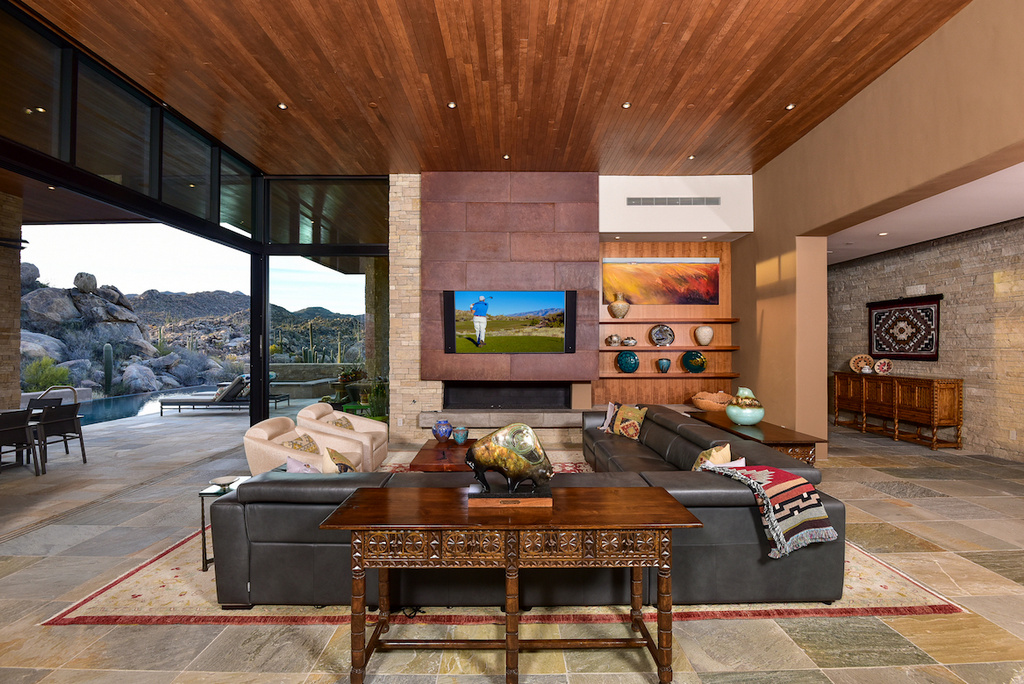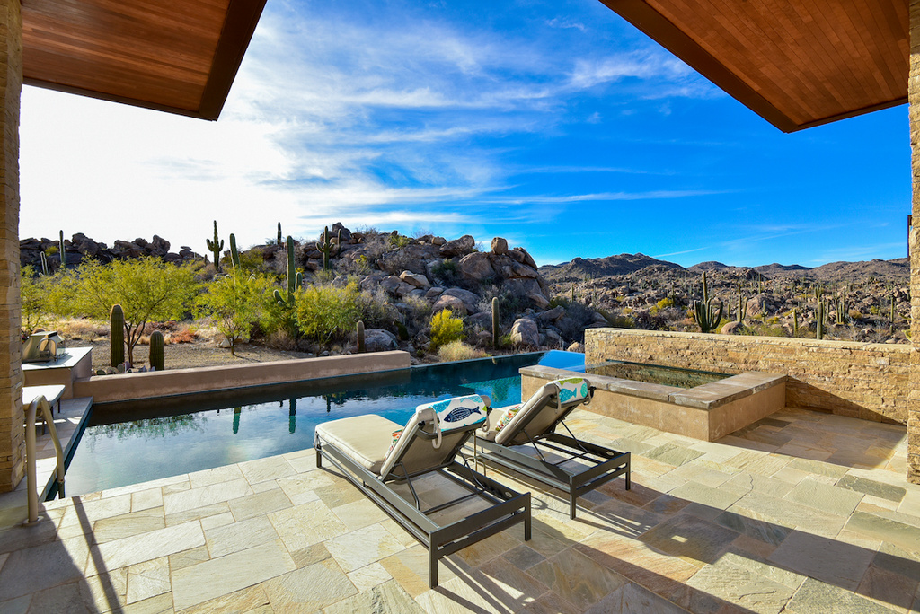 Striking desert contemporary by top local architect Kevin Howard enjoys serene and private vistas of the rugged, saguaro-studded Tortolita Mountains. Located high in Stone Canyon, Phil Mickelson’s exclusive guard-gated golf community, this stunning design uses superior natural materials throughout offering every amenity for gracious living: great room with disappearing window wall & awesome kitchen, 700-bottle wine cellar, large dual office, 2-level theater, 3 guest suites, fabulous master with spa-like bath, separate commodes, snail shower plus massage/exercise rm. Outdoor amenities offer true AZ style relaxation: neg edge saltwater pool & spa, linear gas firepit & TV sitting areas, BBQ, rooftop deck w/360° views of rugged Tortolita & majestic Catalina Mtns. Furnishings avail. Membership required.