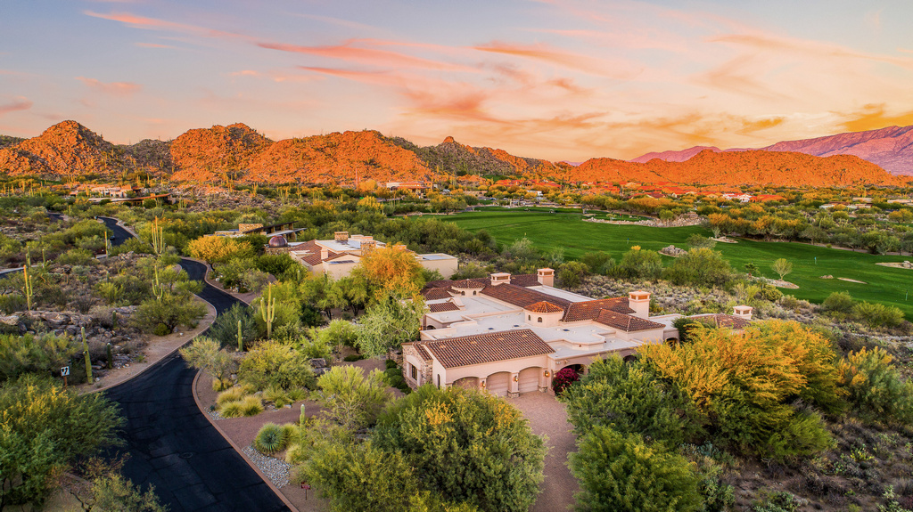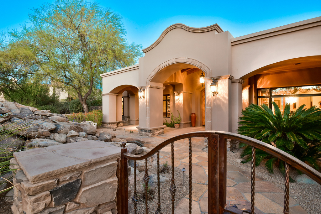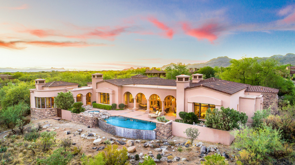 Timeless Mediterranean design inspired by Portugal’s classic architecture rich with traditional elements for refined elegance and casual practicality. Furnished luxury residence in Stone Canyon with 2-room guest house offers true sanctuary for today’s home life with separate spaces: formal & casual living/dining, library, 2 offices, rec/media, exercise, private master & guest suites. Scenic golf and Catalina Mountain views! Architecture by Kevin Howard, masonry construction by master builder Jeff Willmeng, interior design by Lori Carroll, ASID. Inviting elements include Cantera fireplaces, wood beams, Kashmir slate floors, wood doors, courtyard waterfall, neg-edge pool/spa, lush landscaping. Exclusive Stone Canyon Club owned by Phil Mickelson hosted TNT’s 2020 Match III charity golf event. Offered fully furnished excluding select artwork, accessories, and personal items. Located close to private Clubhouse and Fitness Center on best street in guard-gated Stone Canyon. Circular drive, 3-car garage, single level with no interior steps. Privacy and amazing east-facing views on Stone Canyon’s championship private golf course for the perfect laid-back AZ lifestyle!