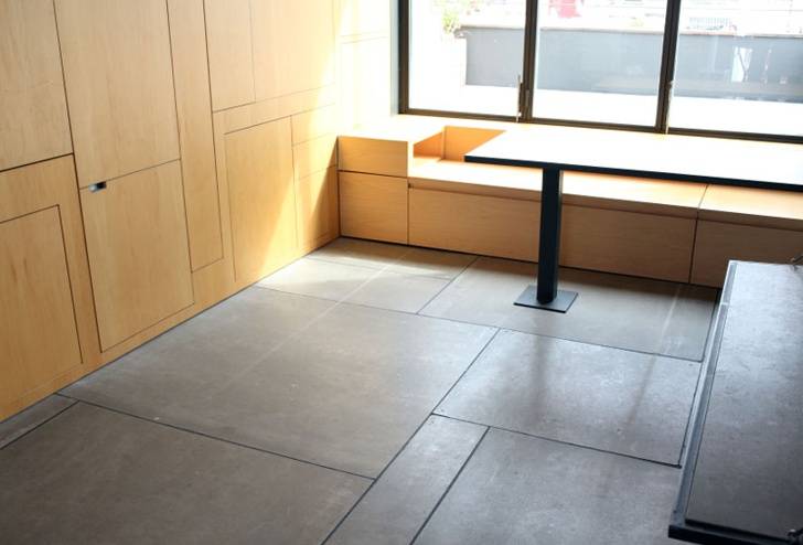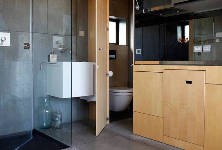 While hiding seems the design’s chief philosophy, the bathroom is all about show-and-tell. A glass box stands on one end of the apartment, containing a sink and shower head. Luckily, the toilet is tucked away.