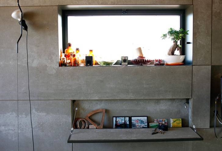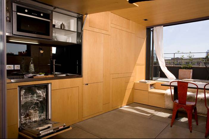 Clickable cabinets line one side of the space. These spring-loaded compartments open to reveal a kitchen, refrigerator, closet space and room for sports equipment. To cook or have lunch, a table folds down from the opposite wall and to rest on a pillar-shaped support.