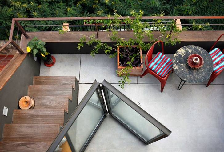 The bed is stored underground, but slides trundle-like from beneath the patio. Halfway revealed, the mattress functions as a daybed from which a full-motion mounted television can be seen.