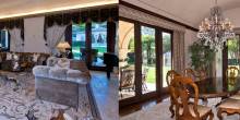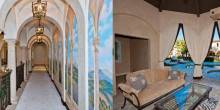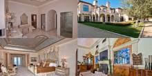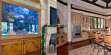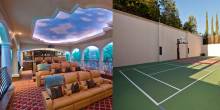 Inside, the home offers Venetian plaster walls, large built-in saltwater fish tanks, Tromp L’oeil murals, 30-foot entryway ceilings, theatre, gym, full spa (therapy rooms, sauna, and tanning salon), wood-paneled home office, spacious walk-in closets, a shower that appears big enough to hang out in, floor-to-ceiling windows and more.