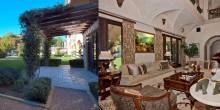Outdoor features include a circular motor court, 2,100-square-foot sports court, large garage, pool and loggia, roomy guesthouse, fountains, outdoor kitchen and perfectly lush lawns.