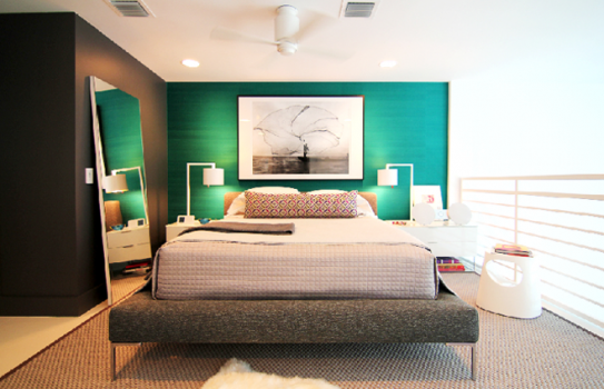 A vibrant emerald green silk wallpaper gives this master bedroom loft a bold, yet sophisticated feel.