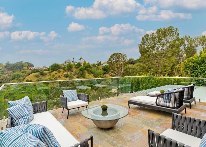 The property itself merges Tudor architectural elements with modern design, creating a space that’s both timeless and elegant. It sits quietly on a cul-de-sac adjacent to the natural expanses of Beverly Glen Park, offering peace and stunning views. The primary suite is a highlight, featuring a dual-sided fireplace, an extensive seating area, and a large sun terrace with sweeping views of the canyon, city, and ocean.