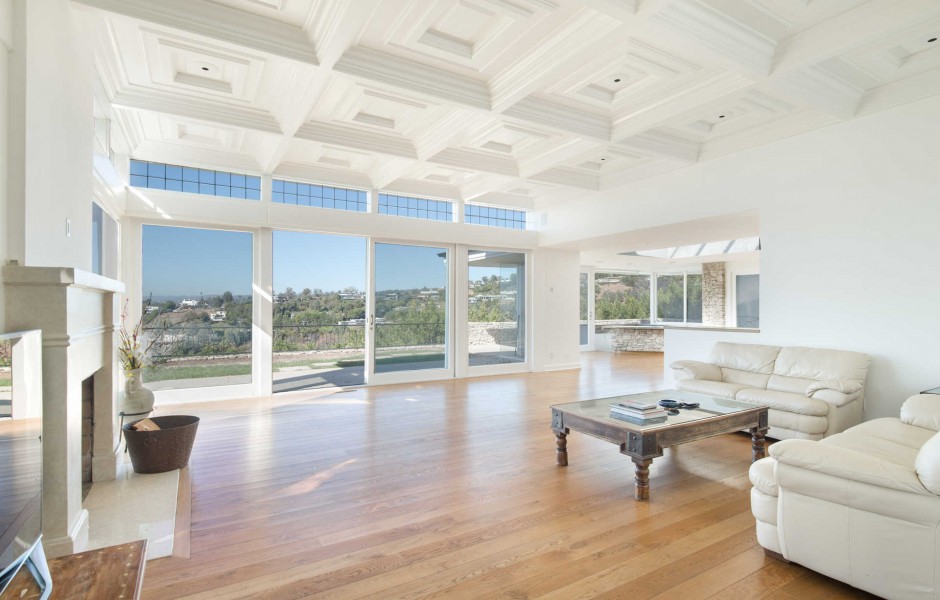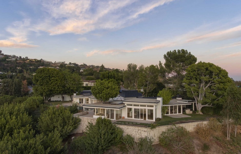 A long driveway and four-car motor court lead to the estate, situated atop a coveted 1.18 acres in a quiet cul-de-sac within the exclusive Trousdale Estates community. The light-filled interior is designed with high ceilings, hardwood floors, and floor-to-ceiling windows and includes an elegant master suite, two additional bedrooms, five bathrooms, and several fireplaces.