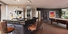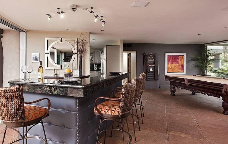 In addition to a pool, spa, and home theater, the home has retractable glass walls that open its full backside, leading to extended patios with barbecue area and bar.