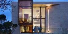 Inspired by Tod Williams’ Tarlo ‘Wall’ House and Norman Jaffe’s Perlbinder House (both completed in the 70s), this structure features a two-story travertine entry façade, cantilevered afromosia stair landing, floor-to-ceiling glass sliding panels, lighting by Belgian company Kreon and an open floorplan with dining room, kitchen, three children’s bedrooms, master bedroom with balcony and ample living room space.