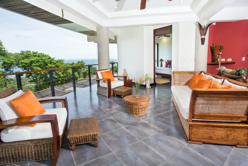 Continuing upward, where you can enjoy even more dramatic sunsets and views you will encounter the 2 bed 2 bath penthouse with a large open-air sitting area and gourmet kitchen. Above, venture to the level where you will find a special upper floor that serves as a contemplative yoga/ exercise/napping space. From here you walk out to a large sundeck featuring a lovely Jacuzzi tub and stunning views of the jungle, Manuel Antonio National Park and seemingly endless surrounding waters.