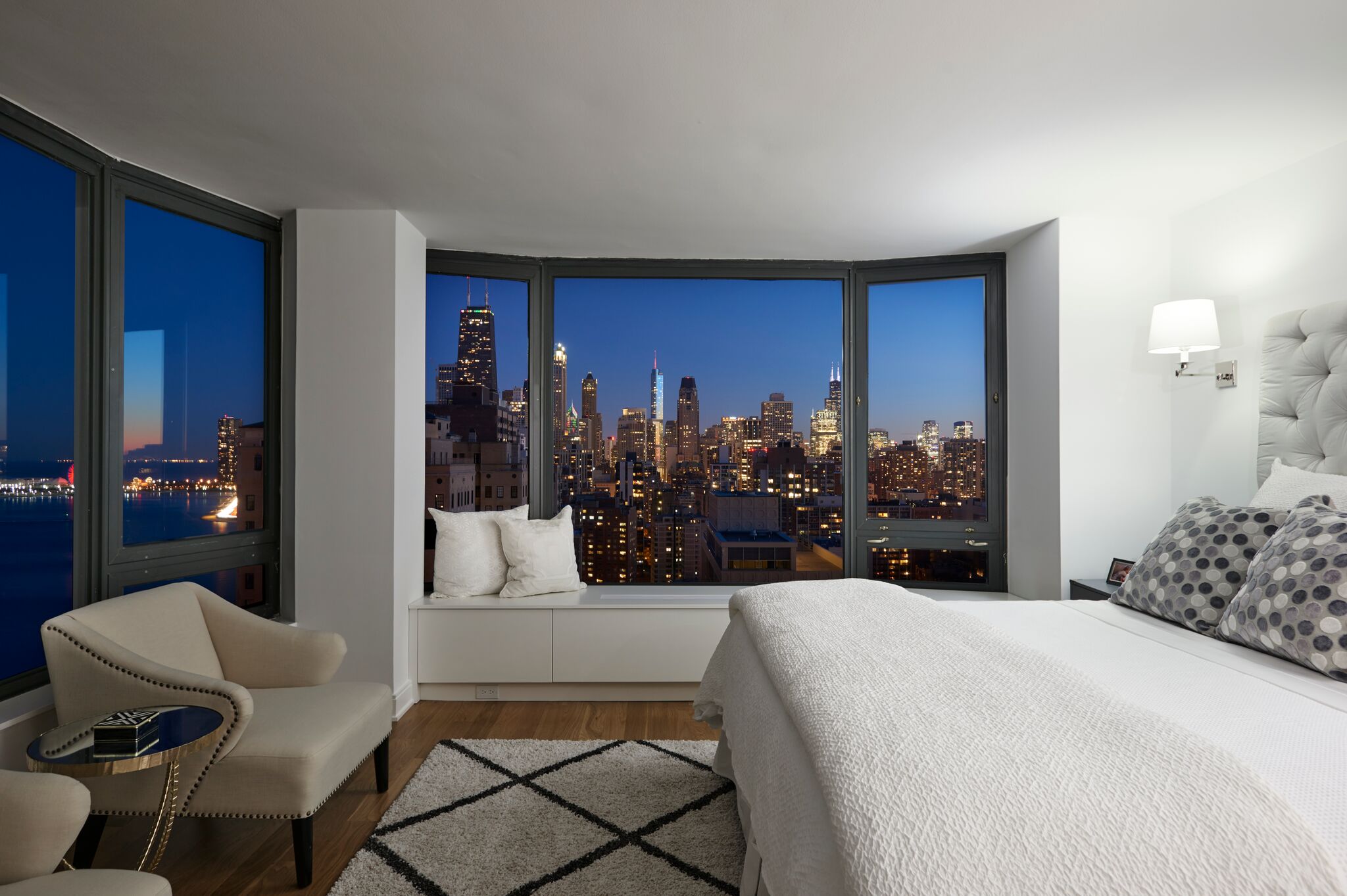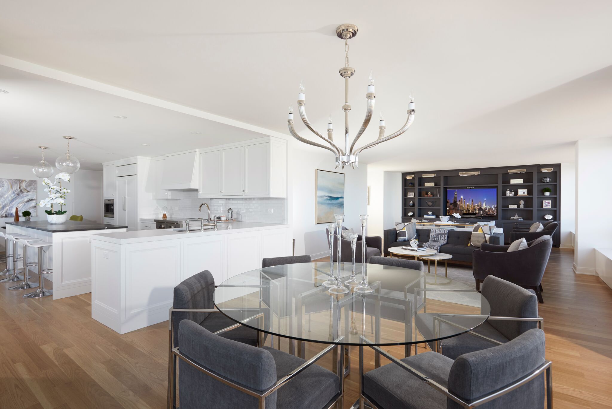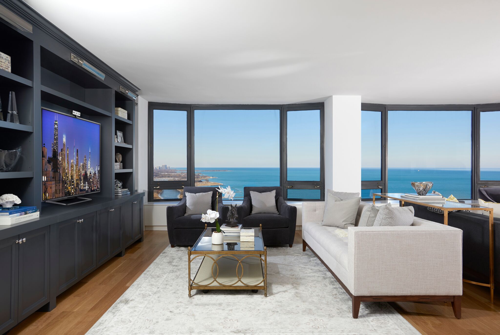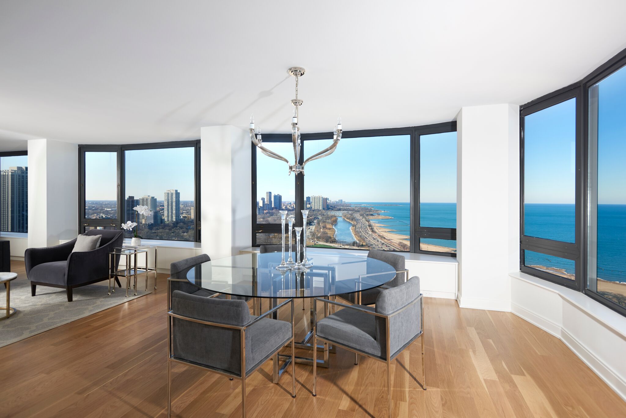 Breathtaking views in every direction throughout this 3 bedroom half floor residence. Complete renovation with exquisite finishes to appeal to the most particular buyers with solid oak floors, custom cabinetry, new electrical work, and Ann Sacks tile. Oversized living space with dramatic built-ins with picture lights, art wall, and impressive corner dining room. Custom eat-in kitchen with top of the line Subzero and Wolf appliance package, New Style cabinetry, Kallista fixtures, and Silestone Quartz counters and back splash. Southeast corner master suite with views of Lake Michigan and the Chicago skyline, a 11’x12’ WIC with built-in island with drawers on 2 sides, and spa-like bath with steam shower. Two additional bedrooms, a bold powder room, and laundry room round out this floor plan. Doorman, gym, pool, tennis court, on-site management and maintenance staff. Parking is $175 per space with complimentary guest parking.