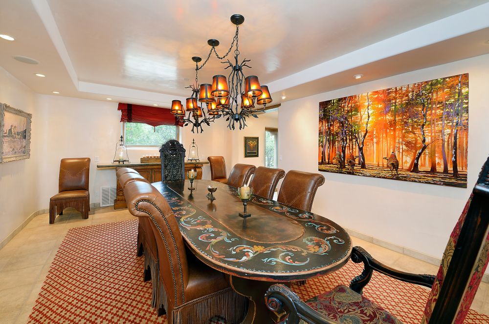 Located in one of Santa Fe’s most exclusive neighborhoods, this gated 7-acre luxurious estate presents a rare kind of grandeur. Designed with two separate wings, both feature beautifully equipped kitchens, entertainment areas, multiple patios, pergolas, terraces and decks with lush garden and breathtaking mountain vistas. The entry portal lined with columns and stacked stone pillars advances to the entrance and a foyer with soaring ceilings, tile floors and a wood-burning fireplace. A built-in audio system, bar and catering kitchen offer the facility and scale for gracious entertaining. Family and guests will find ultimate comfort and privacy in three impressive guest bedrooms with ensuite baths and two second-level master suites.