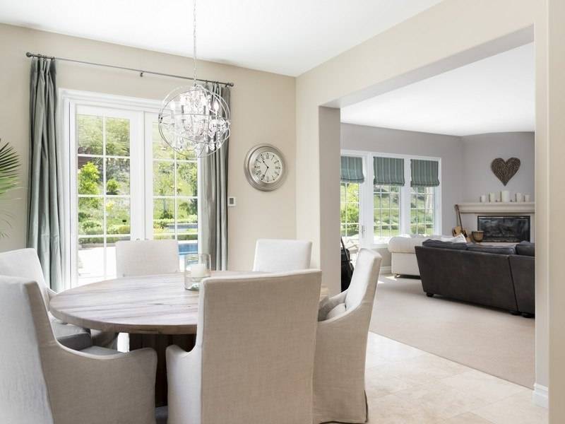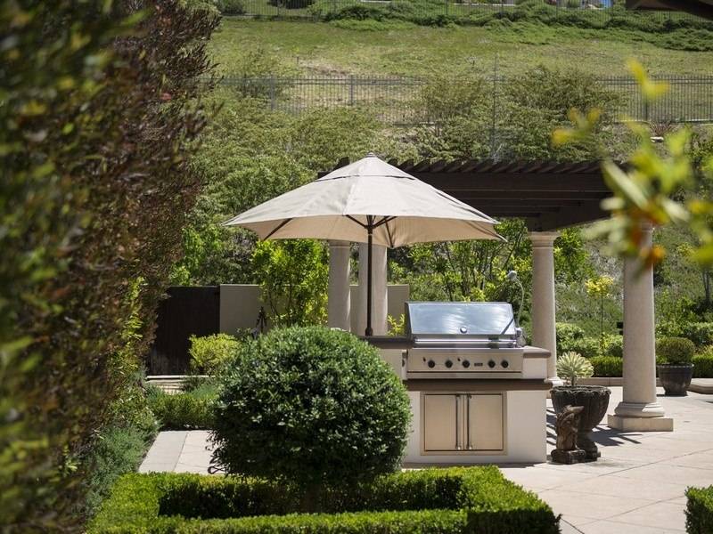Out back rests a pool and spa along with several water features, plus a barbecue station, covered patio, side garden with fruit trees, and numerous seating enclaves, making the estate ideal site for intimate gatherings year-round.