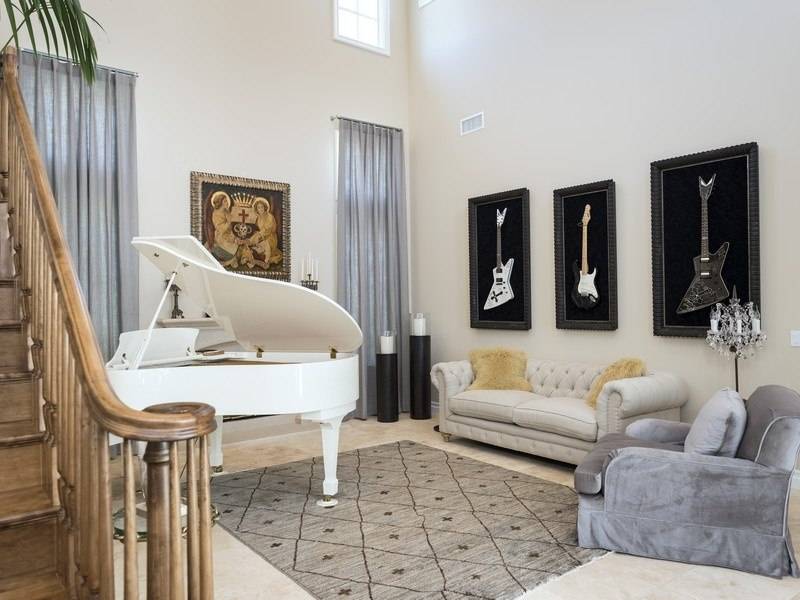 The rocker’s Calabasas spread features five bedrooms and seven baths, plus a courtyard and wine cellar—not to mention a living room teeming with guitars and a grand piano.