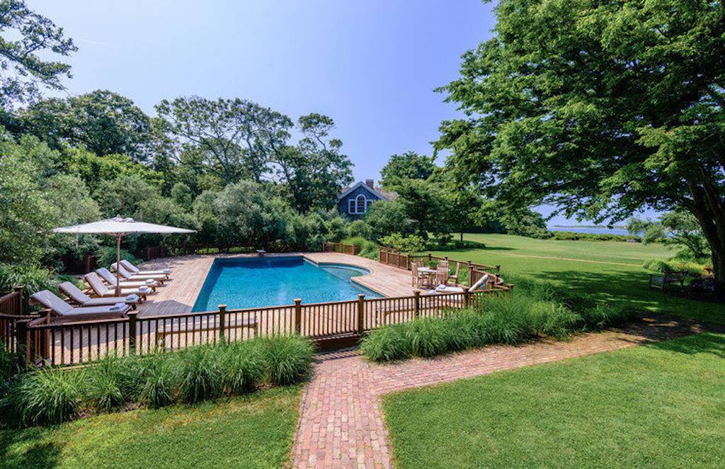 “Briar Patch”—on Georgica Pond in East Hampton Village—is perched upon 11.2 acres, with a sweeping lawn, gardens, mature sycamore, maple and linden trees, trails, and a private pond habitat to local swans, egret, and heron.