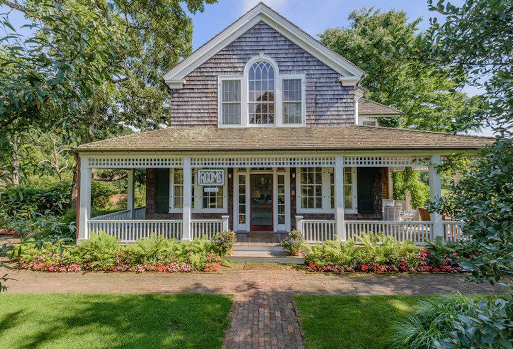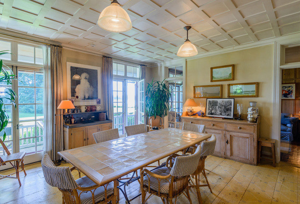 Details include two-foot-wide reclaimed floorboards, handmade wallpaper, and hand-stenciled ceilings. Each of the ground-floor rooms feature French doors opening to large porches.