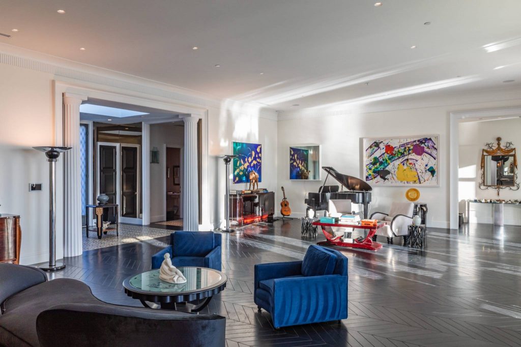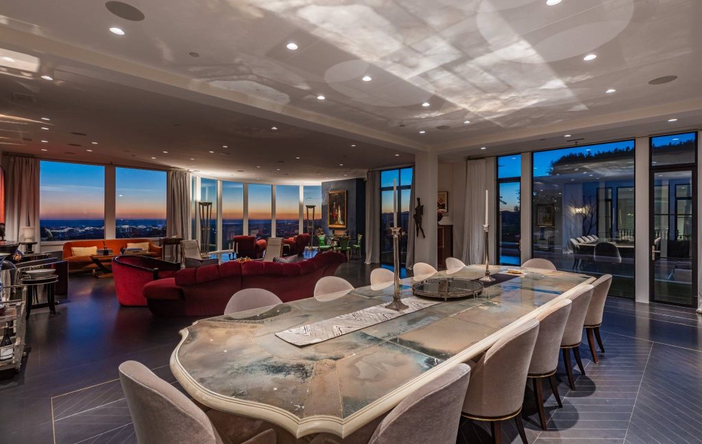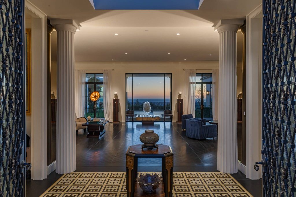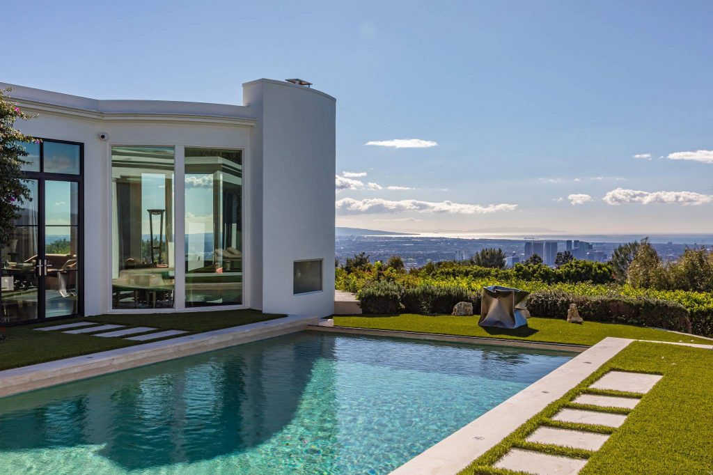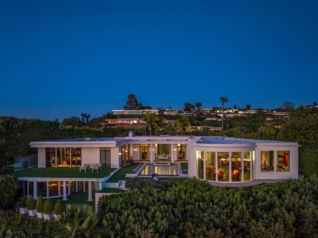 Set on a tranquil cul-de-sac in the prestigious Trousdale Estates, this rare two-story residence occupies a promontory lot with sweeping, unobstructed views spanning the city, canyon, and Pacific Ocean. An unusually wide frontage and expansive grounds, flanked by rare olive trees, & a private orchard producing seasonal fruits and vegetables, creating a sense of privacy. Designed with a refined sense of scale, the open concept layout features soaring ceilings & chevron patterned wood floors. A dramatic entry unfolds into light-filled living and entertaining spaces, anchored by a chef’s kitchen and a luxurious primary suite. Walls of glass reveal an infinity-edge outdoor pool with breathtaking ocean views of the city below. The primary bathroom has an indoor pool that delivers a rare resort experience within the home. Casa Alta Tierra is an estate of seclusion and distinction, set against a striking panoramic backdrop.