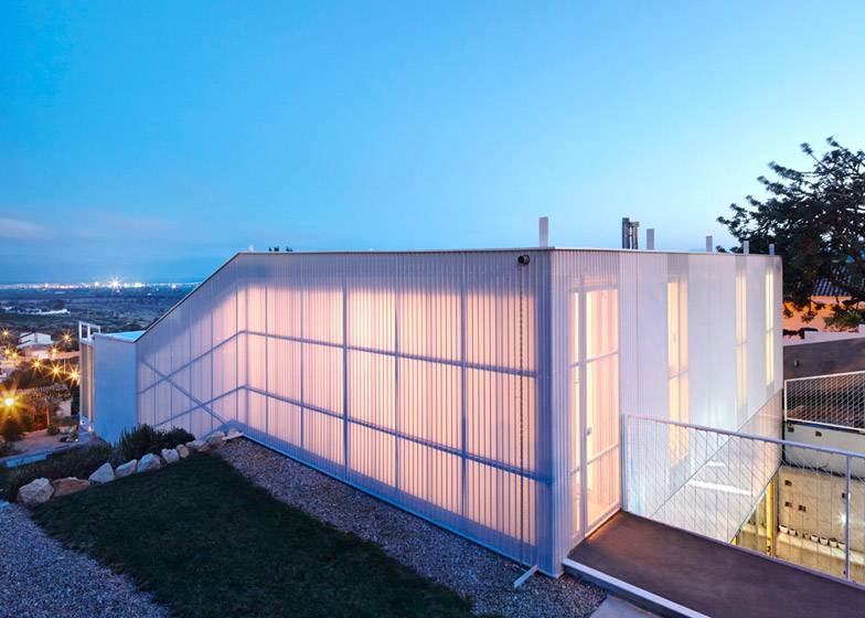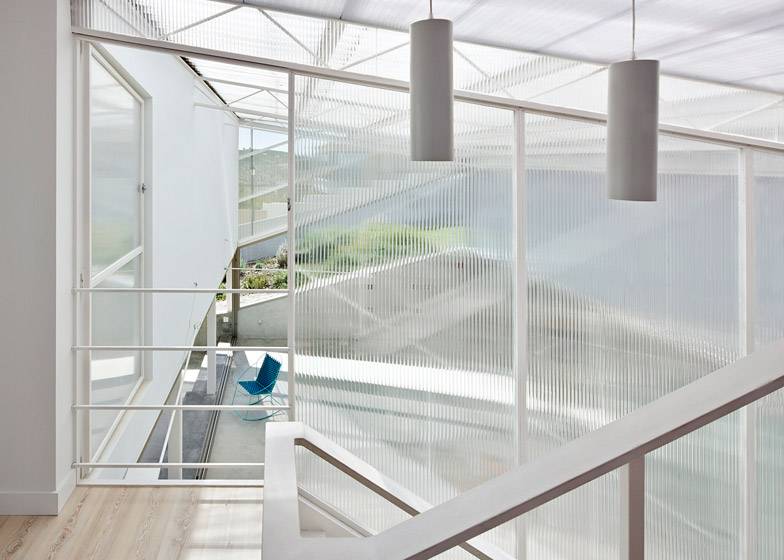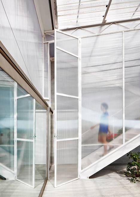 Concrete slabs and a double layer of cellular polycarbonate panelling—a type of corrugated plastic with strong insulating properties—create different levels of insulation around the house’s exterior.