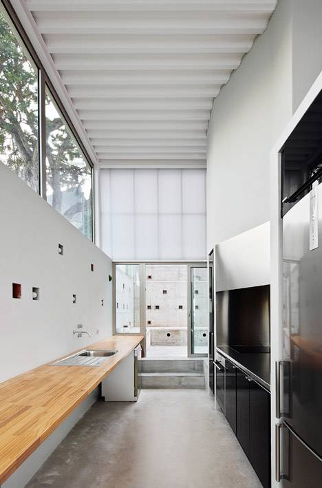 The covered porch—with a cast concrete floor and translucent panels of plastic and glass—is a space the architects say is both “open and closed at the same time.” People can access this area either by taking a flight of concrete steps that wind down the hillside to the lower floor, or a walkway which leads to the upper floor from the back of the building.