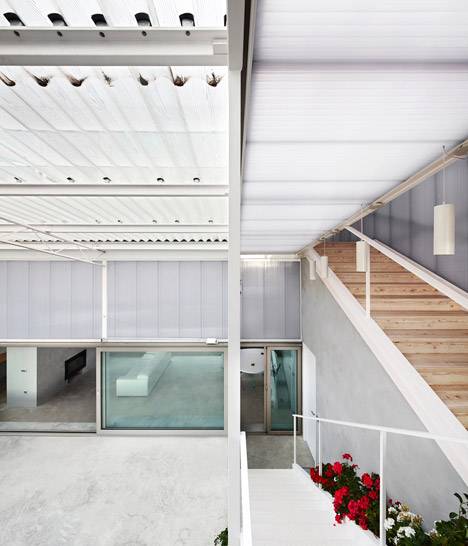 Supported by a white metal framework, the panelling, gives the house a glowing white coloring that manages to blend with the neighbouring properties.