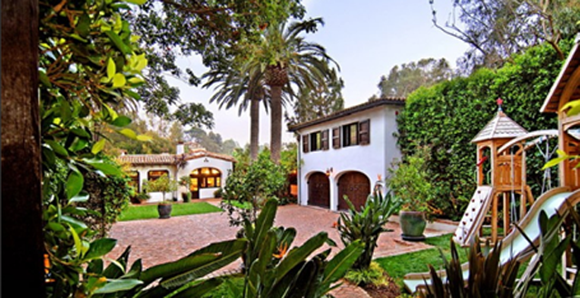 The exquisite property is professionally decorated with distinct Spanish influence imbuing the predominantly neutral spaces with hints of soft blues and greens to marry the interior with the exterior which features beautiful hand-made ceramic and Saltillo tile work, a spacious in-ground pool, and lounge area. Mature foliage and lush green landscaping keep this house sheltered from paparazzi in the celebrity flooded neighborhood of Outpost Estates neighborhood in Los Angeles, CA, home to the likes of Charlize Theron, Orlando Bloom, and Hugh Laurie to name a few.