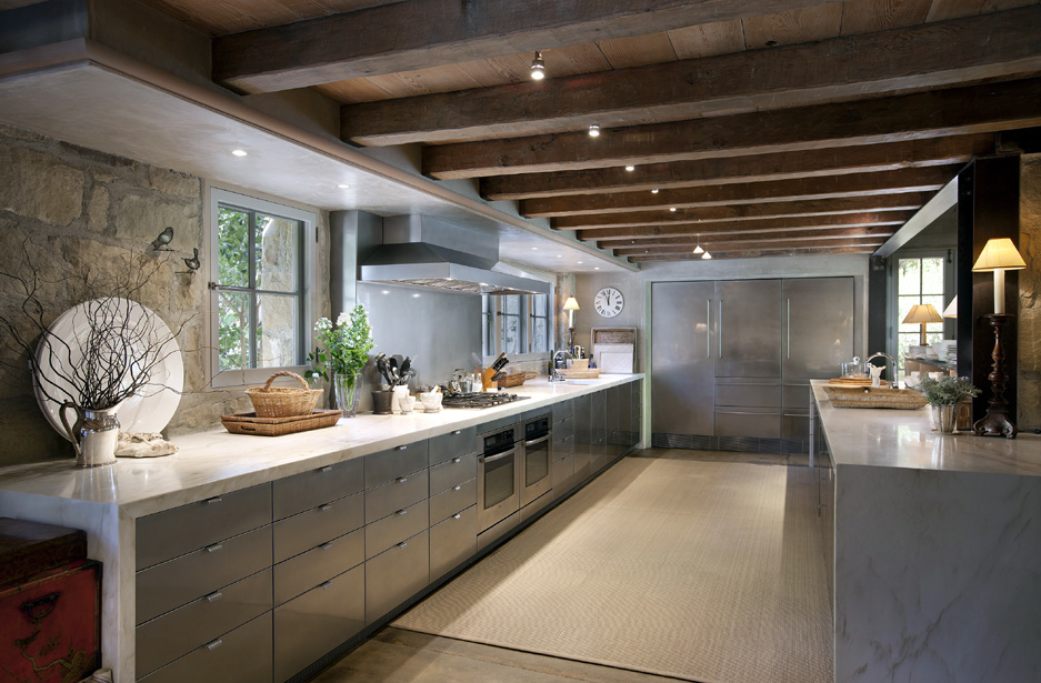 With a mixture of vintage pieces and modern accents, the space is homey yet modern with a sense of antiquity. The only departure from this trend within the home is in the kitchen, where totally modern designs prevail.