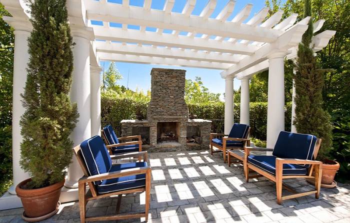 Most of the rooms on the first level open to various terraces and decks that overlook the estate’s grounds (teeming with trees and shrubbery), which also house an amorphous swimming pool and spa, accompanied by a trellised, stacked-stone fireplace.