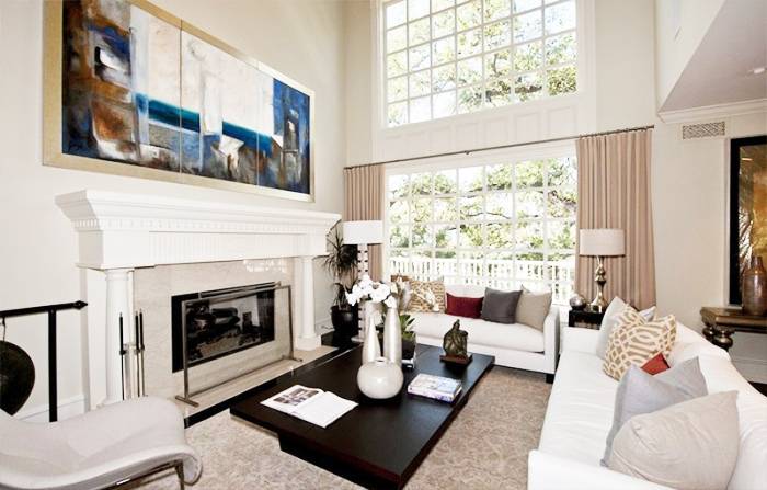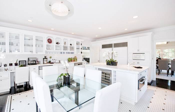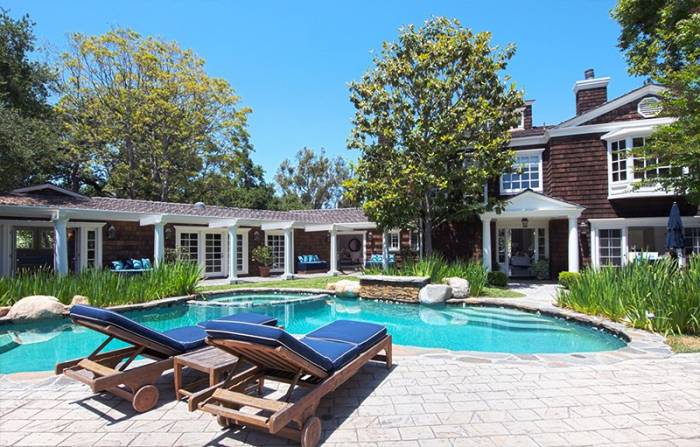 The three-story residence—which Carrie Fisher (a.k.a. “Princess Leia”) once called home—showcases a spacious living-dining room combo with double-height ceilings and six baths, not to mention a black-and-white eat-in kitchen outfitted with marble countertops and custom-tile flooring.