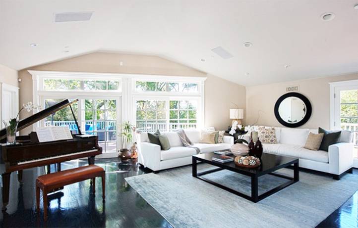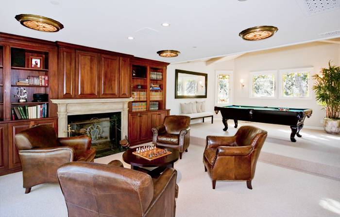 To boot, there’s a trio of en suite guest rooms (one with a fireplace), and not one, but two master suites: one on the top level, and one on the main floor originally touted as a game room/den (perhaps a space reserved for baby Everly?).