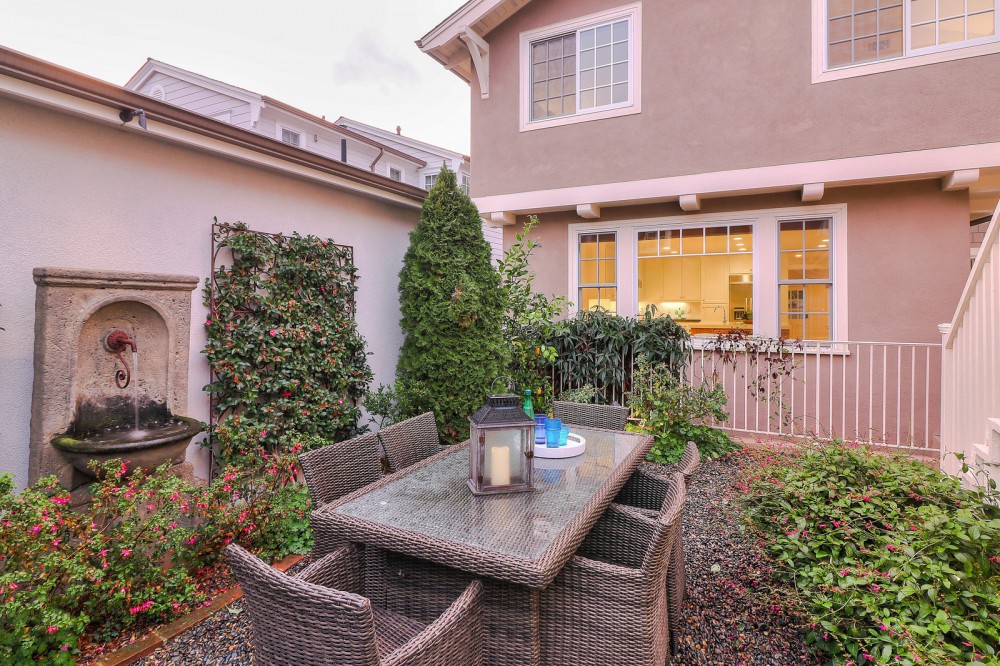 Inspired by charming English gardens, the rear yard exhibits thoughtfully placed bushes, shrubs, a pair of citrus trees and beautiful concrete fountain.  Combining the lovely brick and cement driveway with the garden area, the rear yard becomes a delightful venue for outdoor entertaining.