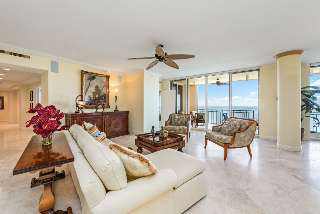 Exceptional penthouse, end residence located at Belize within gated Cape Marco. This premier residence boasts 5 bedrooms plus 2 dens, 5 and a half baths, and a private 2-car garage. The private elevator foyer opens to the impressive interior, offering the most luxurious appointments throughout and exceptional views of the Gulf and Ten Thousand Islands. The kitchen and breakfast room are bathed in natural light from the abundance of windows and offer a fireplace, a center island with a gas cooktop, gorgeous cabinetry, and more. The grand salon is the ideal space to entertain and opens to one of three expansive terraces. The spacious master suite is a true sanctuary complete with an attached den, private terrace, sitting room, sauna, 2 walk-in closets plus a cedar-lined closet, jetted soaking tub, and more. The junior master suite boasts an attached sitting room with a dry bar, providing guests with much privacy. The highly sought-after private garage is nearest the elevator lobby – a prime location. Enjoy the upscale amenities available at Cape Marco, including tennis courts and private beach access, in addition to the many amenities Belize offers – fitness center, theater, guest suites, and more.