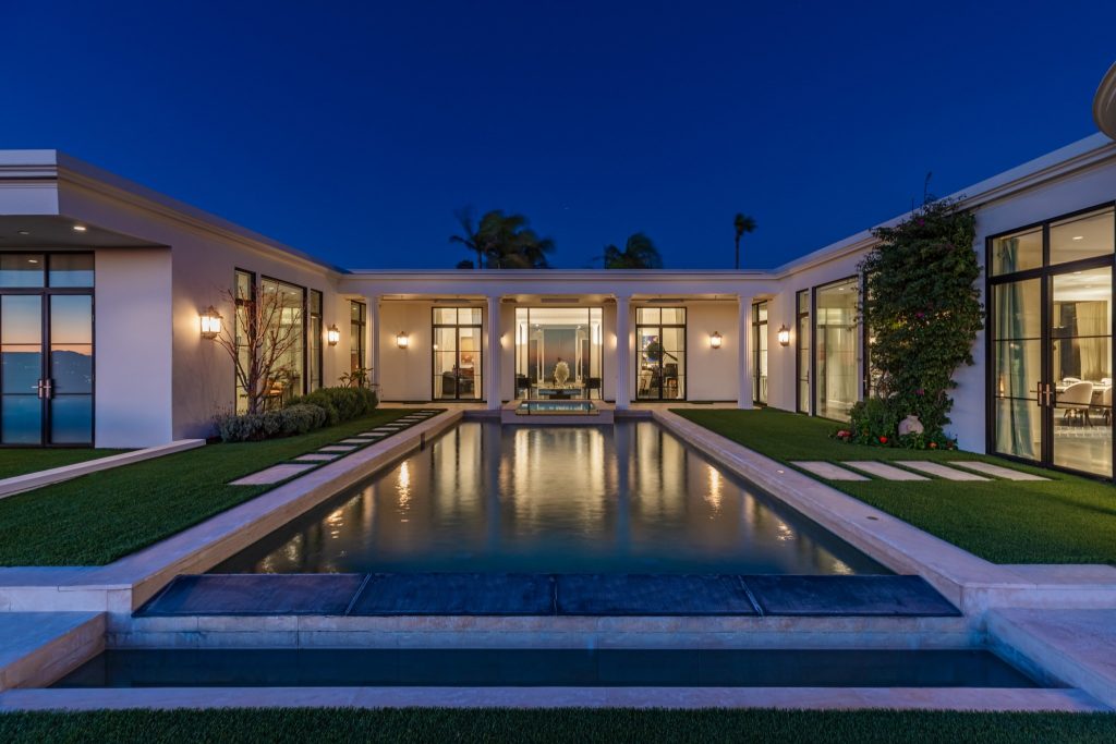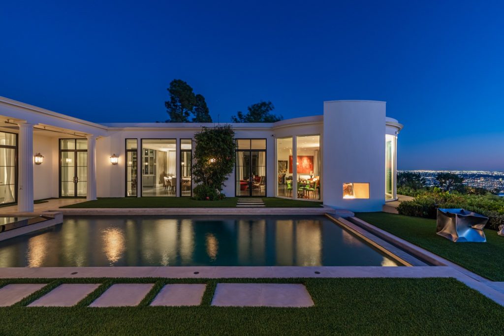 Set on a tranquil cul-de-sac in the prestigious Trousdale Estates, this rare two-story residence occupies a promontory lot with sweeping, unobstructed views spanning the city, canyon, and Pacific Ocean. An unusually wide frontage and expansive grounds, flanked by rare olive trees, & a private orchard producing seasonal fruits and vegetables, creating a sense of privacy. Designed with a refined sense of scale, the open concept layout features soaring ceilings & chevron patterned wood floors. A dramatic entry unfolds into light-filled living and entertaining spaces, anchored by a chef’s kitchen and a luxurious primary suite. Walls of glass reveal an infinity-edge outdoor pool with breathtaking ocean views of the city below. The primary bathroom has an indoor pool that delivers a rare resort experience within the home. Casa Alta Tierra is an estate of seclusion and distinction, set against a striking panoramic backdrop.
