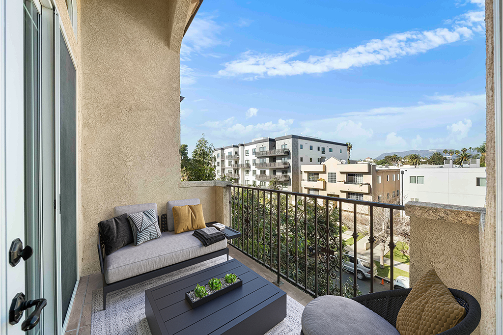 Welcome to this stunning 3-bedroom, 2-bathroom corner penthouse, perfectly situated near the historic charm of Larchmont Village. Offering unrivaled privacy and a quiet, corner position, this home showcases sweeping views of the iconic Hollywood Sign and Griffith Observatory. Upon entry, you’re greeted by soaring 20+ ft ceilings and a magnificent arched window that floods the living space with natural light, creating an inviting atmosphere of openness and elegance. Thoughtful details, including new hardwood floors and recessed lighting, seamlessly tie together the spacious open-concept layout. Step through the large glass doors to your private balcony – perfect for unwinding or enjoying panoramic cityscapes.