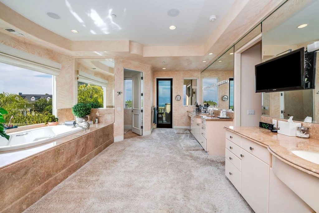 Upstairs, the expansive primary suite offers a private retreat with balconies, dual walk-in closets, and a marble bath with soaking tub, steam shower, and adjoining gym. The backyard is equally impressive, complete with a pool, spa, and lush landscaping set against panoramic views.