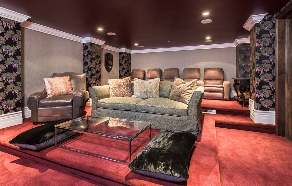 A lower level of recreational amenities includes a plush home theater with stadium seating, an adjoining cocktail lounge, a game room, a gym with a full bathroom, and a wine tasting room and cellar that may house up to 3000 bottles of wine.