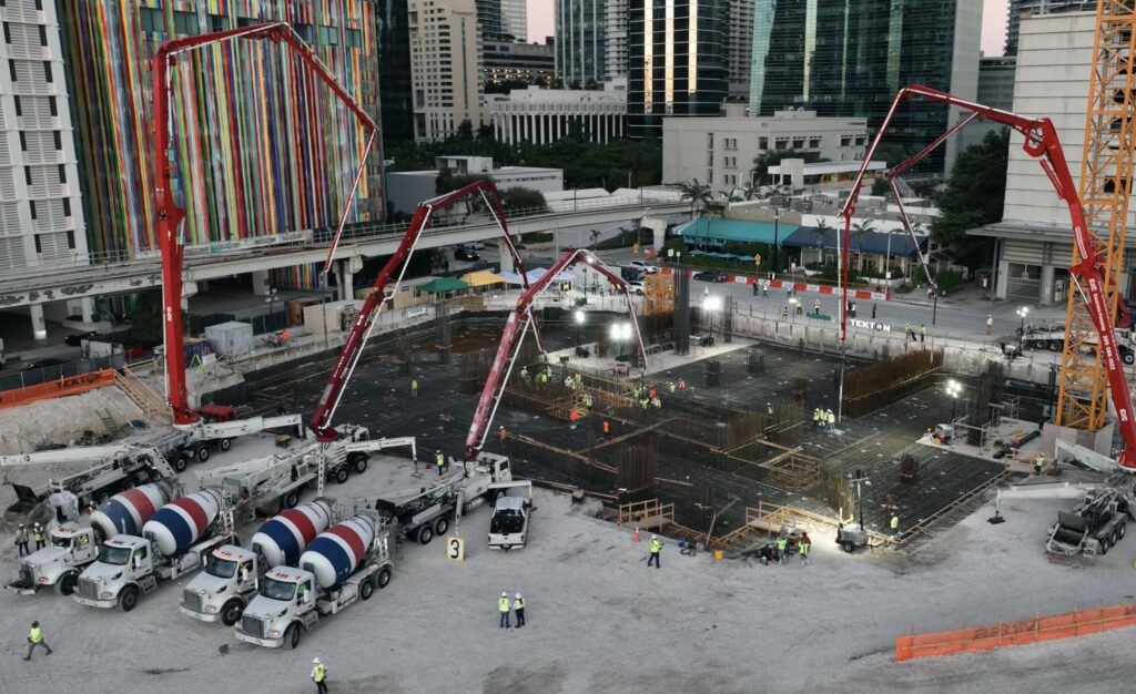 Paving the way for luxurious living on Miami’s skyline, Cipriani Residences Miami and developer Mast Capital complete this year’s largest mat foundation concrete pour in Brickell, Florida. As Cipriani’s first-ever ground-up residential offering in North America, this momentous pour led by Moss Construction also set the record for largest on South Miami Avenue, one of the neighborhood’s most bustling corridors. With over 50 team members involved, the 16-hour continuous concrete pour reached 11,500 cubic yards of foundational concrete with 2,500 tons of reinforcing steel. This marks a monumental achievement in construction and logistical complexity.