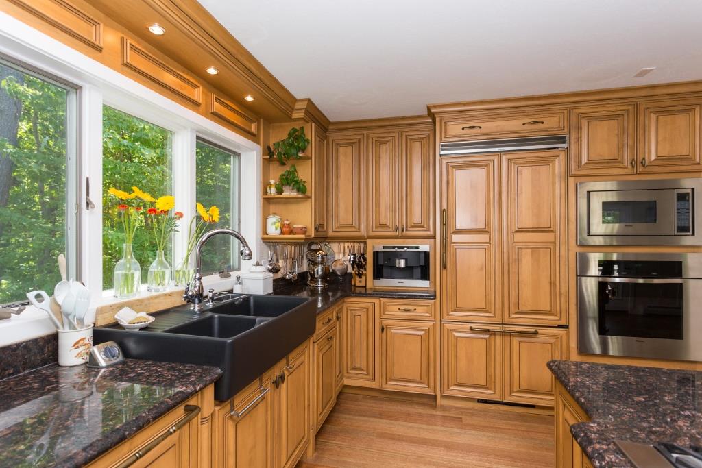 Inside is an exquisite chef’s kitchen blends artistry and function with granite tops, custom maple cabinets, imported Italian marble accents, imported German porcelain sink, downdraft gas cook top with convection oven. All Viking and Miele stainless appliances.