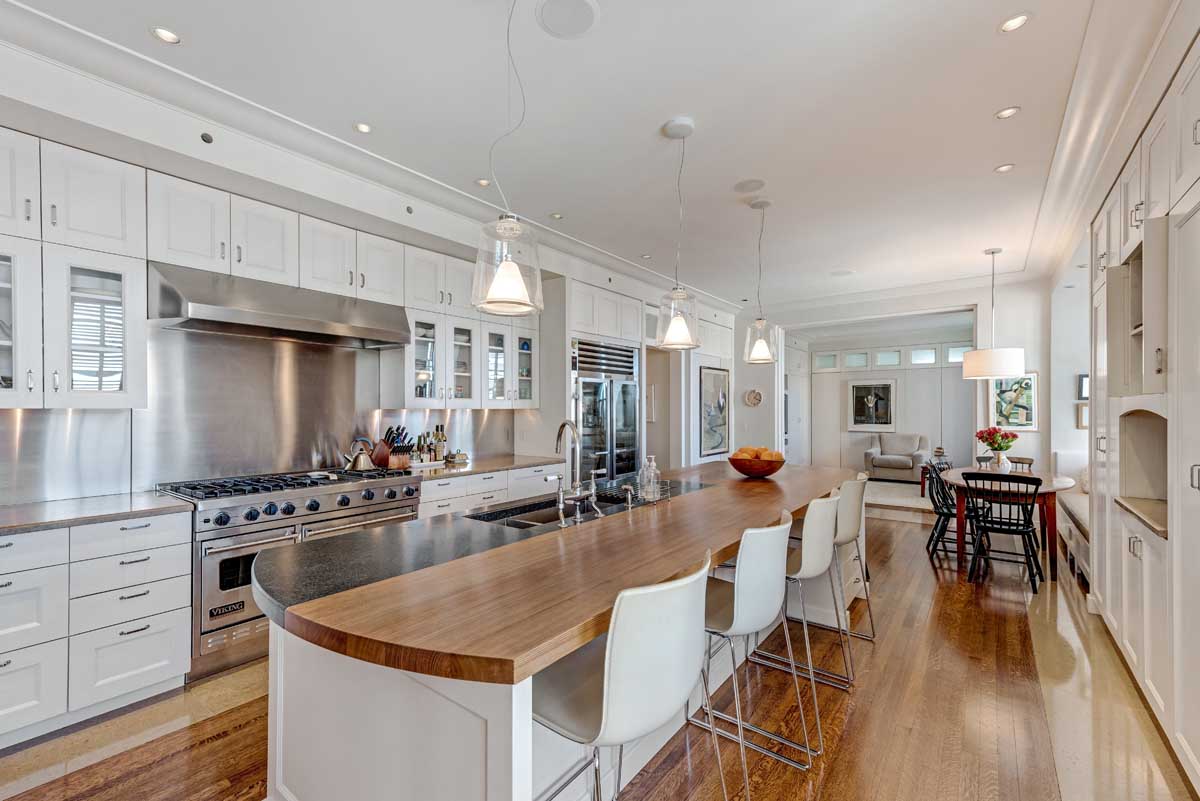 White cabinets surround the contemporary chef’s kitchen, which is connected to the dining room through a butler’s pantry.
