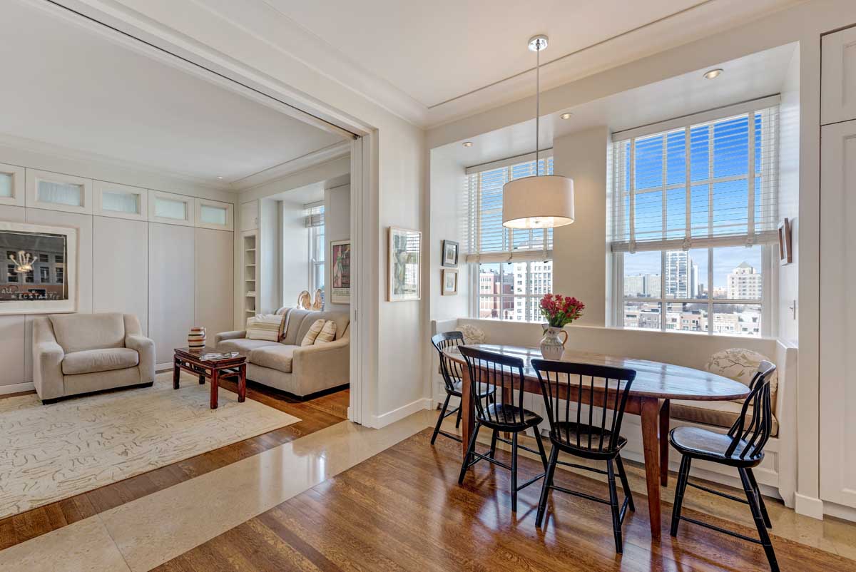 The sunny living room has a full wall of windows providing beautiful vistas of the park and Lake Michigan.