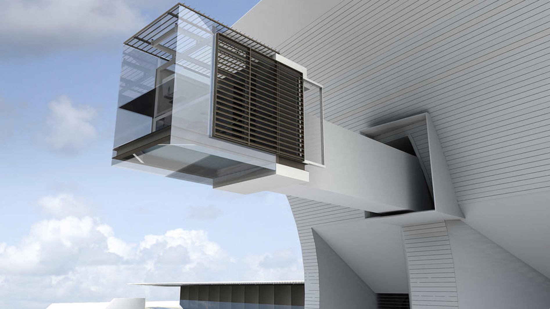 The screens and shells allow for micro-management of day-lighting, heat gain, openness, and privacy. The movable compartments automatically open and close, powered by rooftop solar panels. The Motus living area, which spans from 5,000- to 12,000-square feet, also features a micro-climate evaporation pool to cool the home during the summer.