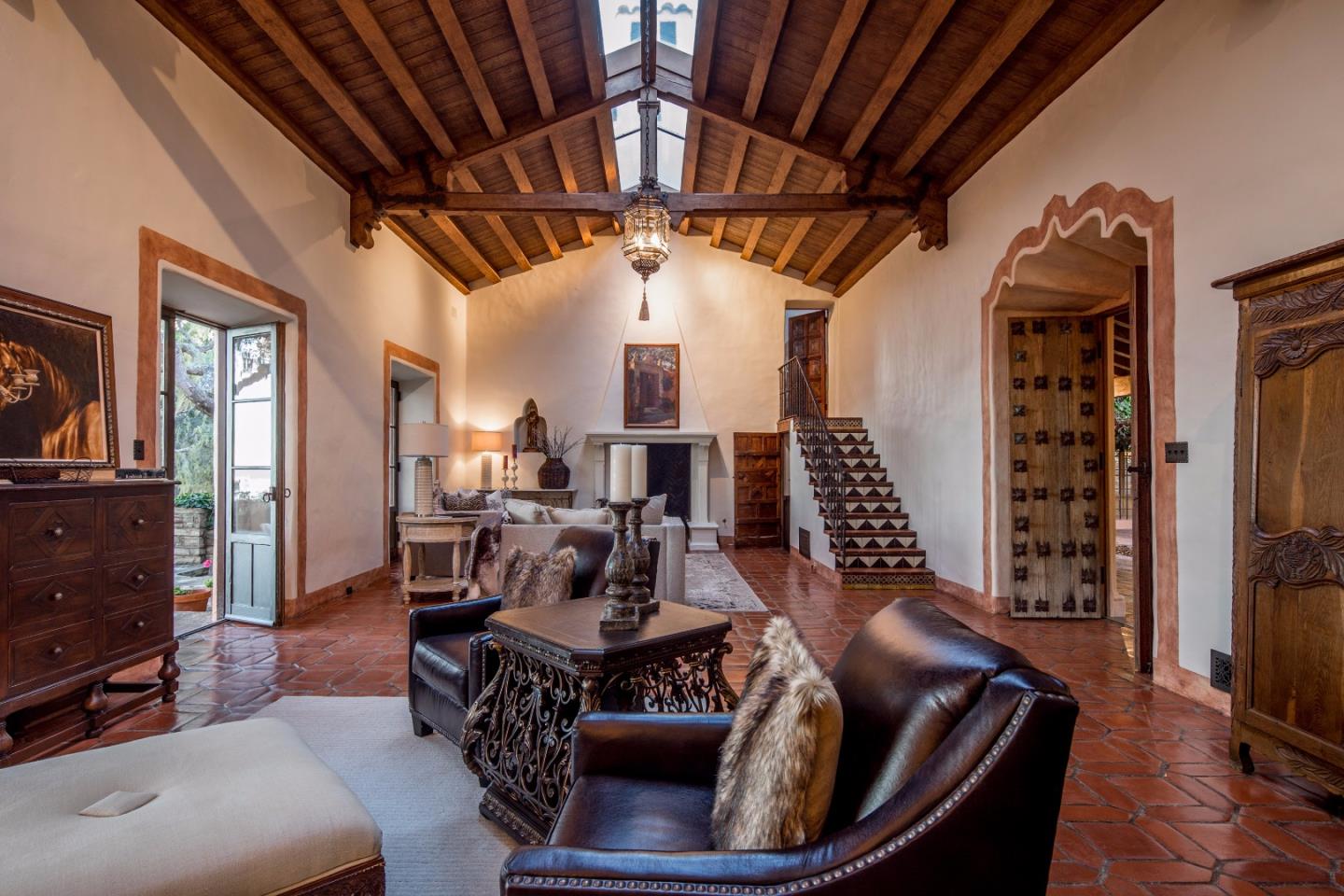 The Spanish architecture is evident in the home’s thick adobe walls, terracotta roof tiles, and ornamental ironwork, as the property website describes.