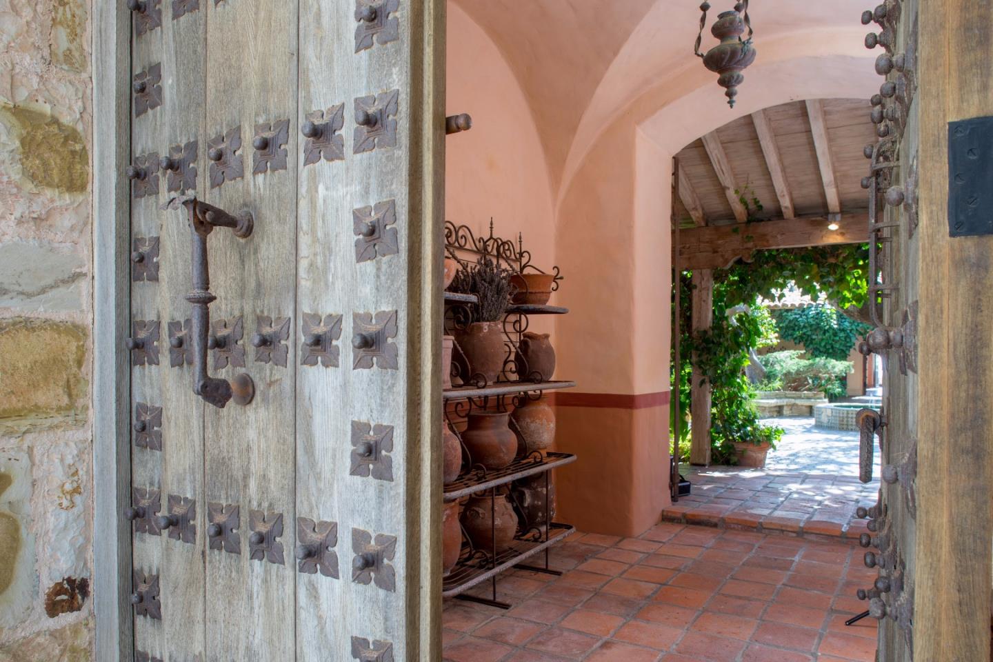 Enormous, hand-carved entry doors, imported from Spain, lead to a charming open-air central courtyard, with canopied oak trees, a fountain, and other greenery.