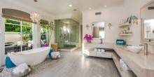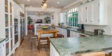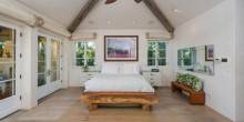 With coastline views and private access to the nearby beach, the 1.6-acre property seems like it would a great choice for entertaining guests. A tennis court, a putting green, a swimming pool, a pergola, and even an outdoor fireplace are found throughout the grounds.