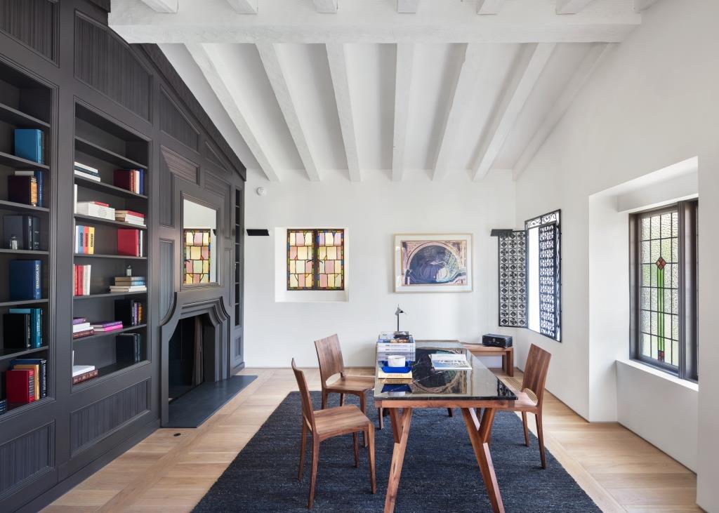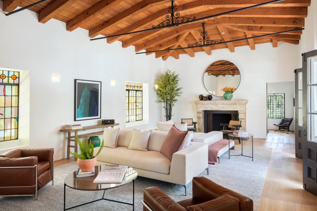 A spacious living room features historic stained-glass windows, high-beamed ceilings, and a stone fireplace.