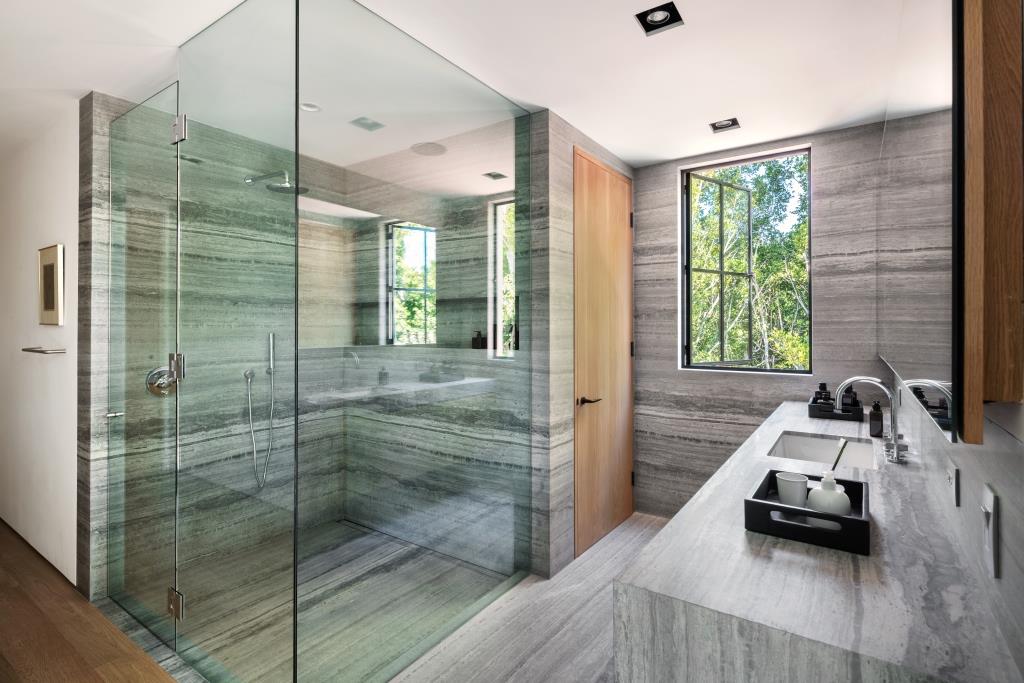 Dual master bathrooms feature luxurious slab marble and walk-in closets.
