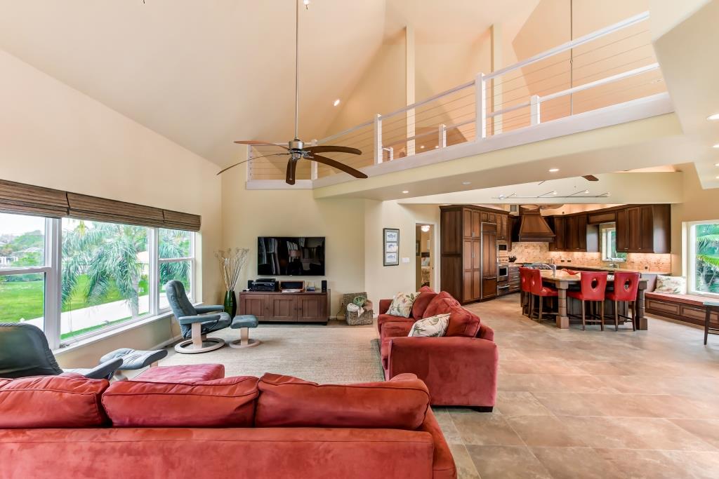 There are vaulted ceilings, new tile floors throughout the main living area and new carpet in bedrooms, remodeled kitchen with upgraded appliances, granite counters, dumb waiter, impact glass windows and doors. The main floor also includes an office.