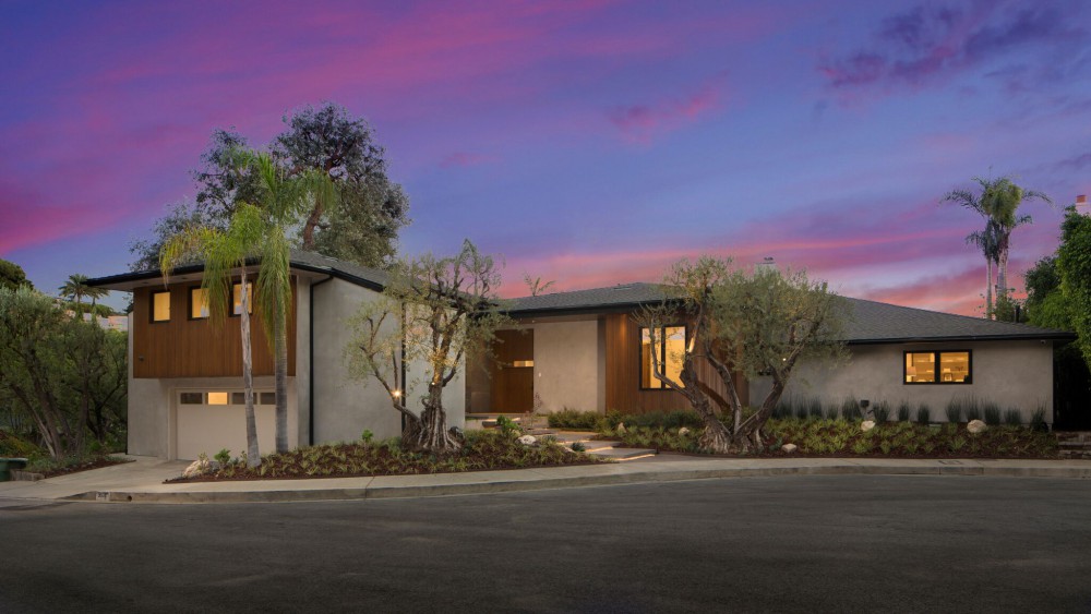 A sophisticated and very private entertainer’s home, this is a newly and beautifully remodeled Beverly Hills contemporary with high ceilings and harmonious grace. Built primarily on one level, the living space is oriented to exquisite canyon and ocean views. A lighted, floating-slab stairway leads to the magnificent, 5-by-10-foot oak front door, which pivots to reveal a spectacular living, dining, family room that opens seamlessly to the patio, pool, and views. Disappearing walls of glass enclose this serene space, which includes a fireplace, built-in display shelving, and temperature-controlled wine storage. The adjacent kitchen offers a breakfast area, counter seating at a large island topped with black Calacatta marble, Miele appliances, and Italian-design cabinets with motorized glass doors. The powder room is highlighted by a backlit vanity. The master bedroom and spa-like master bath both open onto the pool deck, where there are spacious covered and open areas for lounging, dining, and entertaining. In addition to the master suite, there are three family bedrooms plus a large bonus room above the garage that could be a fifth bedroom. Clean, contemporary styling throughout features Fleetwood doors and windows, smart-home systems, recessed lighting, and thoughtful use of natural stone and wood, with all-new plumbing, electrical, and HVAC. Reimagined with exceptional taste and style, this is a tranquil and comfortable residence for indoor-outdoor living.
