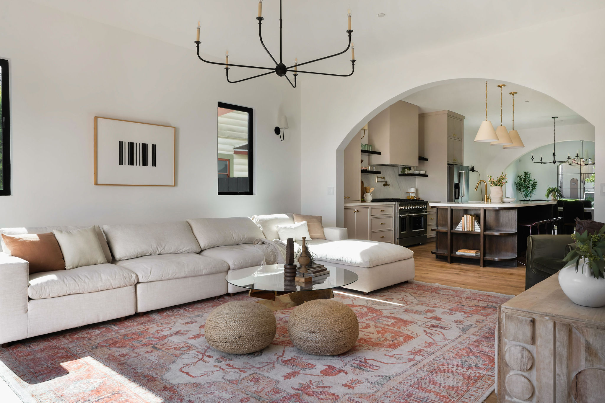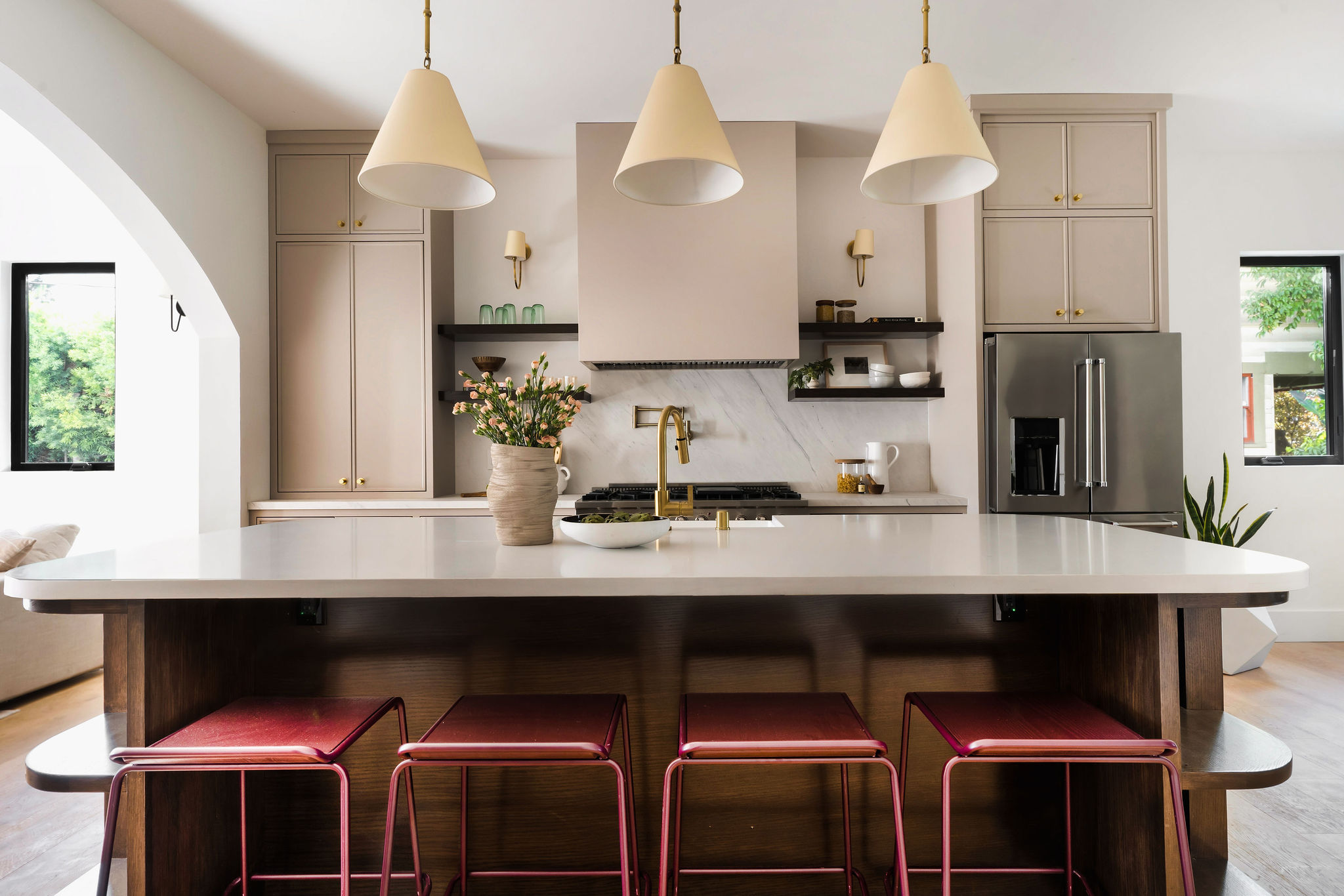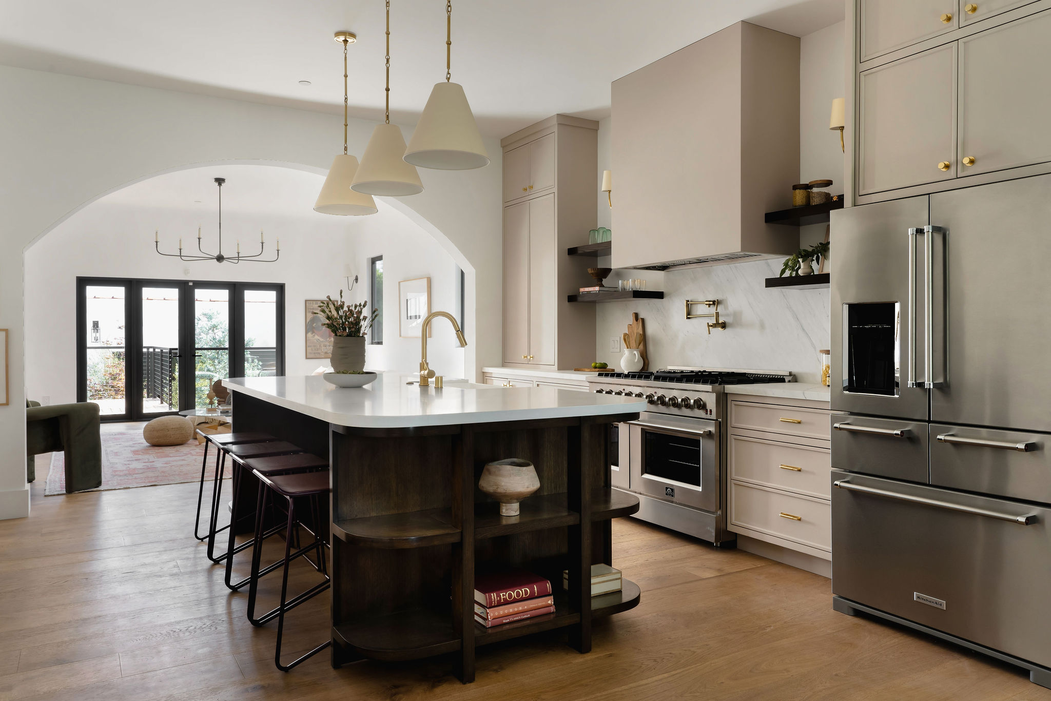 Behind mature trees and plantings, step down the river rock pathway to your own private paradise. From the oversized windows which drench the space in a romantic light, to the vintage solid-wood entry door, to the wide-plank European oak floors, no detail has been spared! Step into lofty 10’ft ceilings, character archways, and an elevated floor plan boasting form and functionality. A large formal sundrenched living room with custom built-in nook and designer sconces leads to an impressive dining room that comfortably seats 8 or more! But the real showstopper is the grand kitchen, with custom floor-to-ceiling cabinets, 8-burner 48” Forno range and Kingston Brass pot filler and faucet, all new stainless Kitchen Aid appliances, custom made expansive island with room for seating and storage, Acrticstone composite farmhouse sink brushed brass Rejuvenation hardware and open wood shelving.
