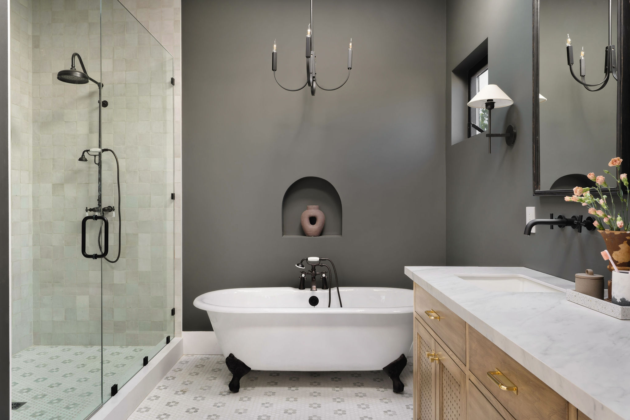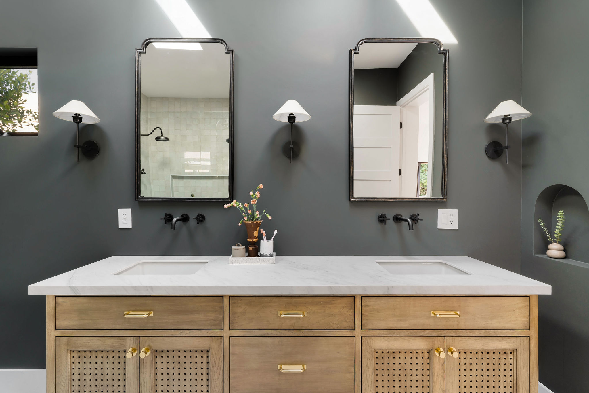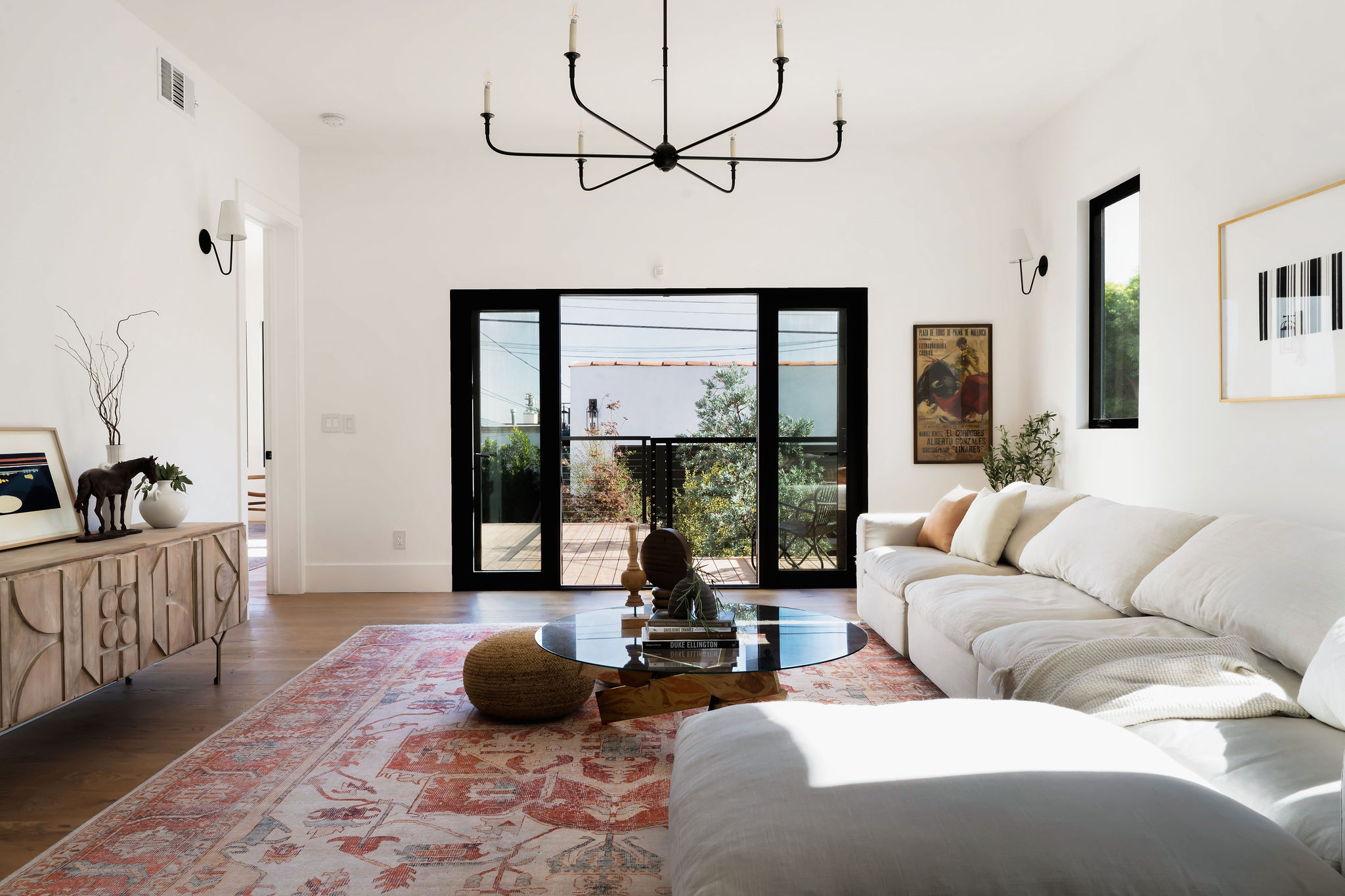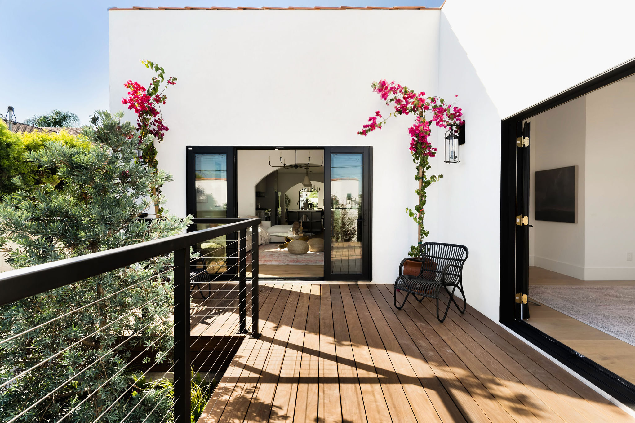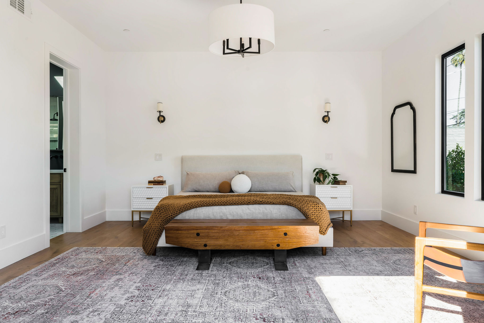 An expansive family room opens through a wall of glass, including new French doors to the durable ipe deck and verdant backyard, showcasing fresh landscaping with olive trees, bougainvillea, and mature privacy hedging. The sophisticated and enormous master bedroom offers designer lighting, a custom closet, large windows to the grassy backyard, plus French doors to the ipe deck. Bask in the dramatic natural overhead light of the master bathroom, and enjoy dual vanity with wall mount hardware, freestanding Signature cast iron tub, double-shower featuring Randolph Morris Mason Hill hardware, separate water closet, marble tile floors, Zia tile wall detail, and designer lighting. 2 spacious guest suites are accessed off their own hallways from the kitchen/dining area – each has its own designer bathroom, one featuring hexagon polished porcelain mosaic floors, the other featuring Carrara white snowflake mosaic tile. Both offer custom vanities, designer lighting, and a shower over tub with Zia tile detail. A large 4th bedroom is the perfect overflow space and can easily access the hall powder bath off of the dining area, with expressive black and white tile floors.