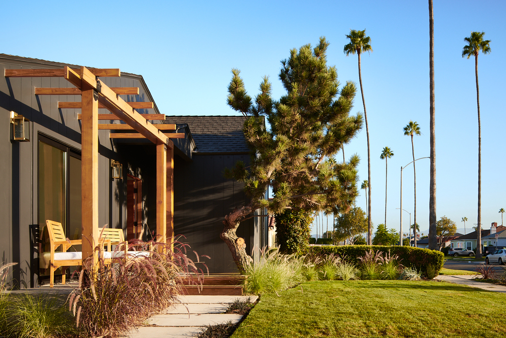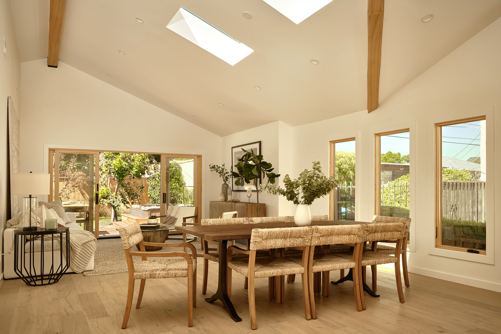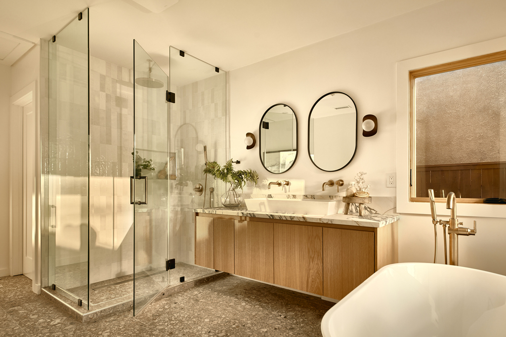 The primary bedroom oasis off the living area is a retreat, boasting a large walk-in closet, sliding doors to the backyard, plus a sophisticated bathroom en suite featuring stunning terrazzo floor tiles, oversized enclosed waterfall shower with brushed brass fixtures, freestanding tub, large vessel sink plus porcelain counters and designer lighting. Vaulted ceilings complete this impressive airy primary suite. 2 additional guest bedrooms offer plenty of space, one with a walk-in closet, sliding door to a front deck plus a stunning en-suite bath featuring porcelain counters, curbless shower with designer pendant light, and custom vanity. Fully irrigated, all new systems. The garage offers extra space and is upgraded with drywall, new electrical + panel, and a new roof. ADU potential! Welcome home!