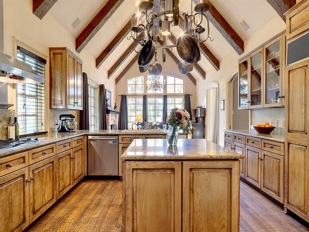French country estate. Canopy of trees protect home with Austin Stone construction. Quality throughout, low maintenance. Second-car drive through garage, half acre lot. Three fireplaces, hearth room with fireplace, wood beam accents and hand scraped hardwoods, vaulted ceiling at kitchen. Wood casement crank windows, kitchen-viking double ovens, decor far cook top, subzero fridge, granite counters, and back splash. Guest spot with bath and master down, loft music room, game room, bonus craft room, two beds, family room with fireplace, and wet bar, sun room with Pennsylvania blue stone study.
